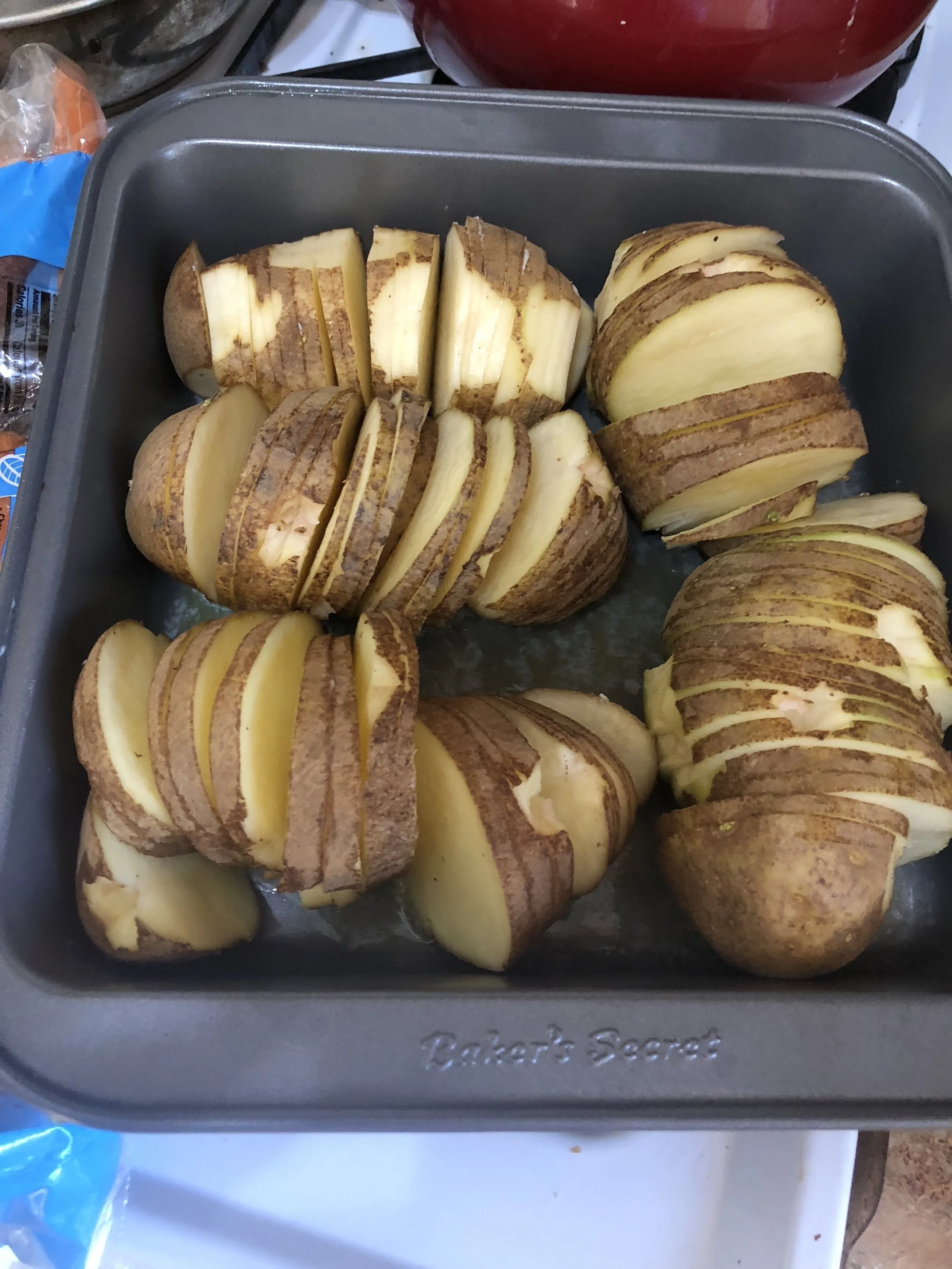Clean and thinly slice the potatoes around the their circumference (see example). Pour some of this mixture into your baking dish so it coats the bottom of the baking dish. Place the potatoes (As many as can be put in) in your baking dish